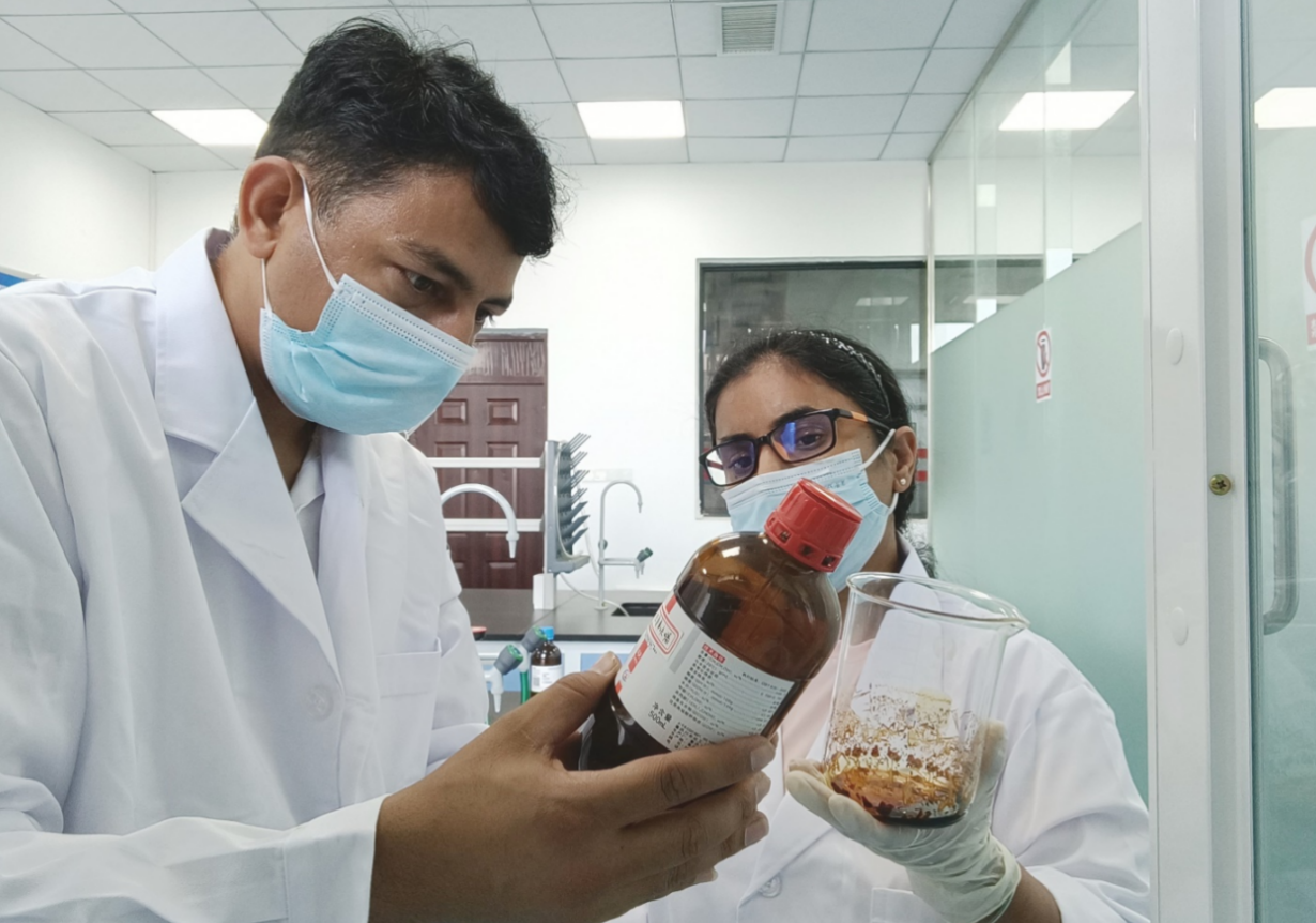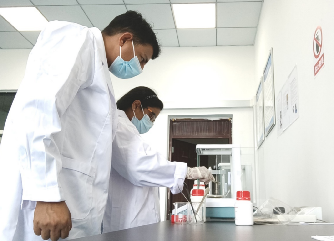 二人为合成陶瓷样品的化学试剂称重。受访者供图