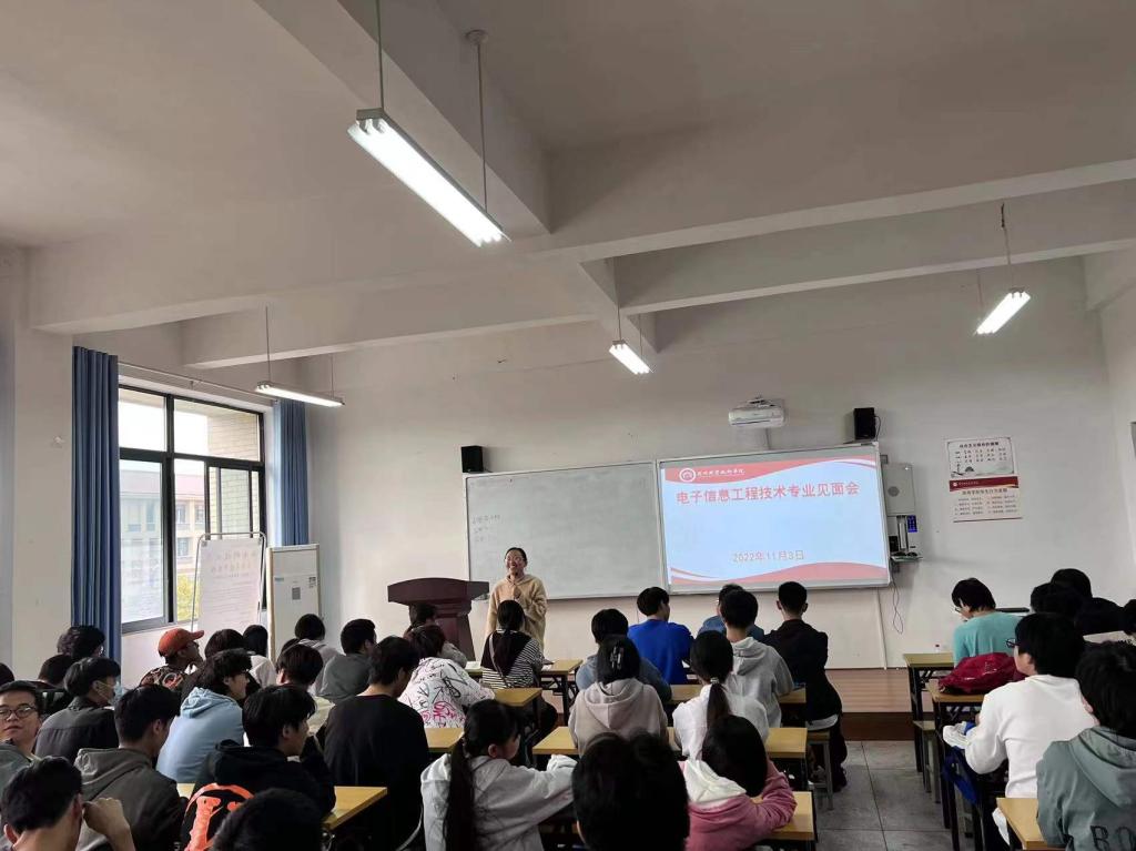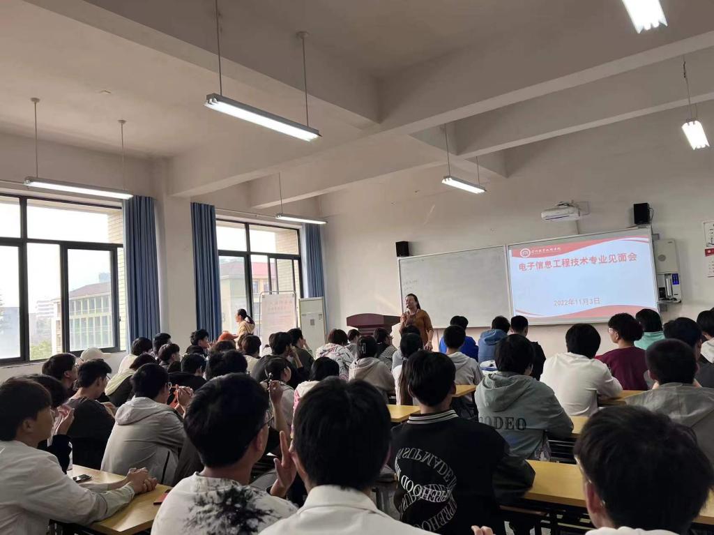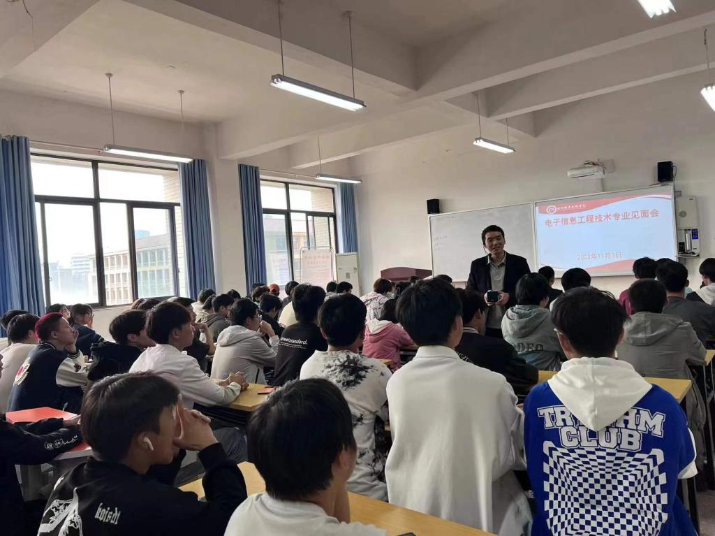 2022年11月3日,电子信息工程技术专业全体教师与2022级新生开展新生专业见面会,进一步让员工了解williamhill官网校园,加强师生之间的相互沟通,加深员工对专业的认识。williamhill经理邱富军、副经理何庆分别就专业前景、就业趋势、学习生活与新生进行了交流分享,鼓励员工在三年的学习中找准定位,实现人生自我价值的飞跃。专业教师代表樊明哲、张艳红就新生三年的学习规划进行了讲解,帮助同学们进行专业解惑,辅导员何盼盼就大学里新的校园生活安全事项进行了叮嘱。