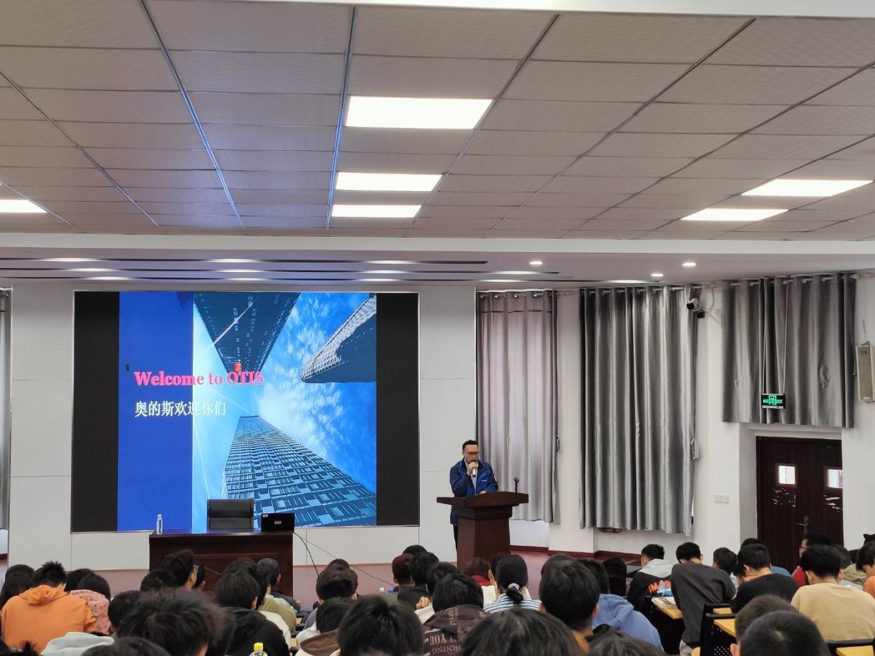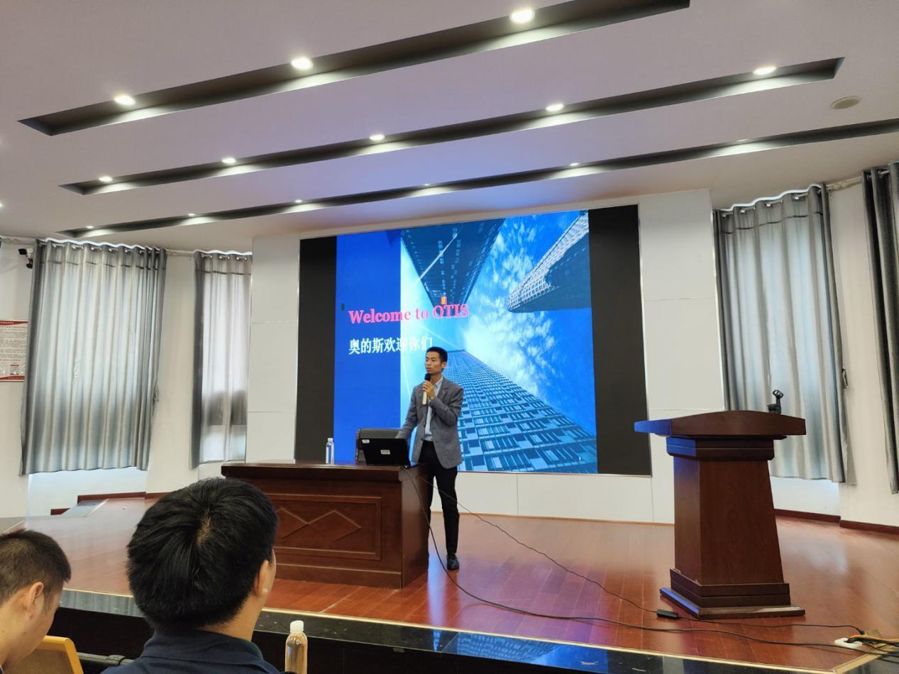 王有明向同学们介绍了奥的斯电梯公司的发展状况、工作岗位、发展模式、企业文化等方面的基本情况,就同学们关心的工作内容、后勤保障、福利待遇、培养方向、职业通道等方面内容逐一解答。