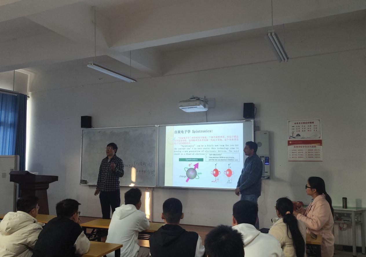Ashwini kumar博士和Poorva Sharma博士通过PPT的形式为同学们讲述了自旋电子学和光伏电池的基础知识与技术发展概况。其中,分子自旋光伏器件(MSP)是基于自旋阀器件结构和富勒烯(C60)分子材料构建的一种新型器件。该器件可在外部光、磁复合场作用下实现电子自旋和电荷输出信号的相互耦合,进而实现全新的器件功能,包括磁场调控太阳能电池开路电压,室温下利用特定操控模式实现可控完全自旋极化电流输出、磁控交流电信号输出、磁控电池开关等。