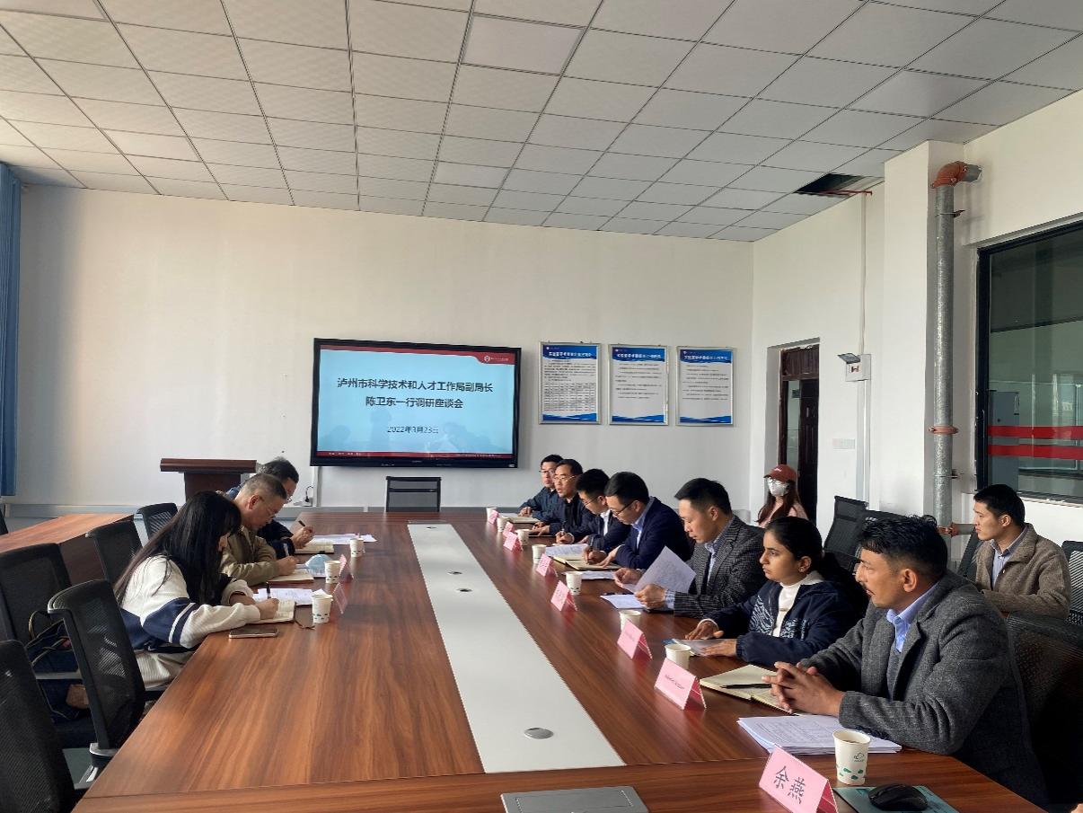 2022年3月23日下午,泸州市科技和人才局陈卫东副局长、外专引智科科长李泽建一行到公司考察指导外专引智工作。公司党委常委、副经理鲍学东、科技处处长陈光玖、人事处处长郎润华、电气与电子工程公司党总支书记兼经理晏剑辉、国际教育公司党总支书记兼经理魏圣坤等陪同调研,科技处余燕陪同翻译。
