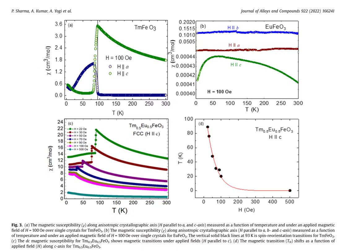 最近,williamhill智能控制与电子器件应用技术泸州市重点实验室Poorva Sharma副教授和Ashwini Kumar副教授团队与上海大学量子与分子结构国际中心物理系的曹世勋教授合作,在基于稀土离子的多功能材料方面取得了重要进展。作者使用光学浮区炉设计并合成了Eu3+离子掺杂的TmFeO3单晶,发现外部磁场对Eu3+-离子掺杂TmFeO 3中的磁性和自旋重取向转变有很大影响。研究结果说明了磁跃迁的重要性,并为实现先进的多功能材料提供了策略。题为“Robust magnetic-field effect on spin-reorientation in Eu3+-modified TmFeO3single crystals”的相关研究工作在线发表在顶级国际学术期刊《合金与化合物杂志》上。