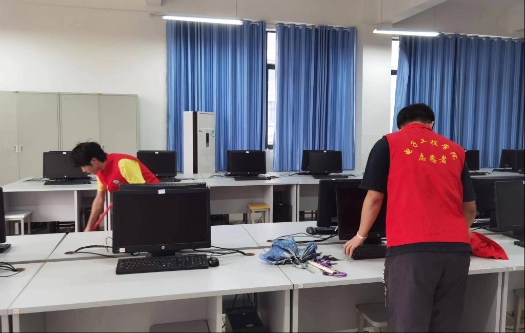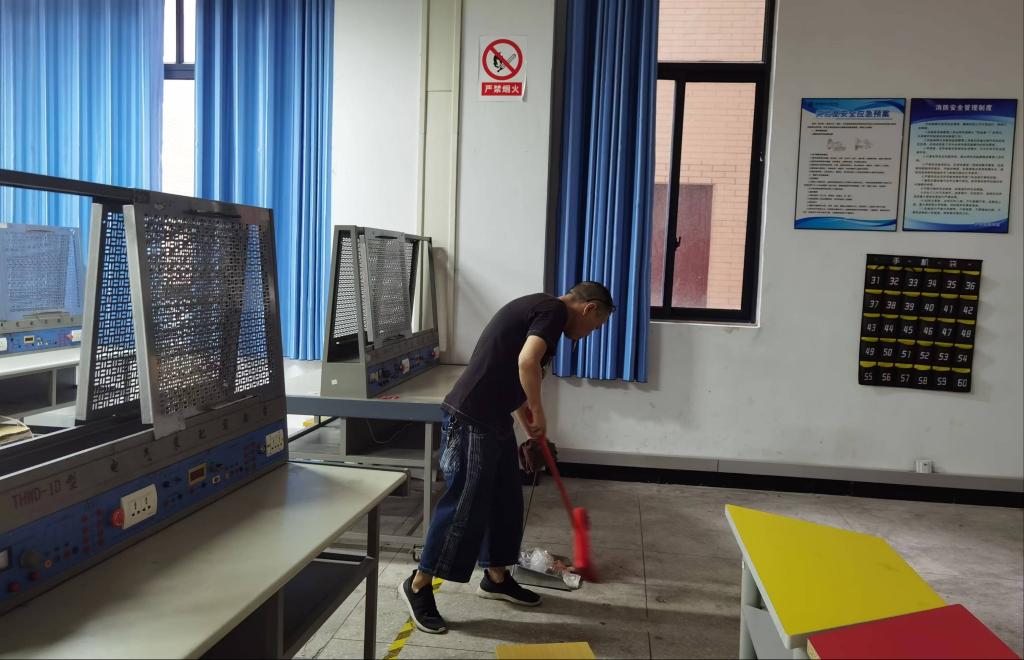在活动中志愿者们合理分工,重点对教室、机房、实训室等地方开展了安全检查和卫生大整治。重点检查门窗、实训室配电箱及机房布线等容易存在安全隐患的地方。在清扫的过程中,互相配合,齐心协力,每个人一丝不苟,将自己负责的区域清扫干净,教学楼焕然一新。