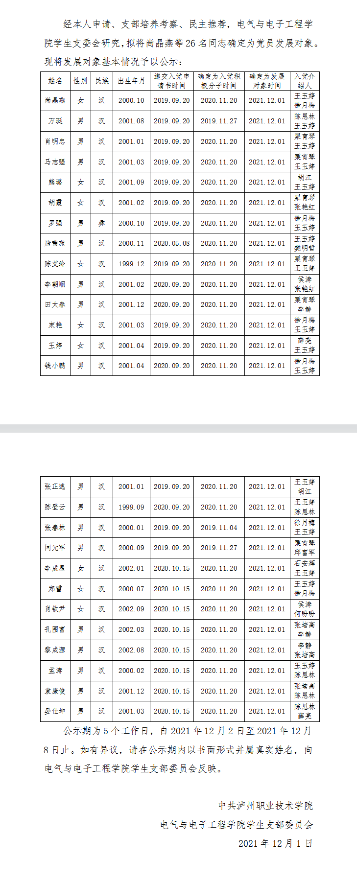 关于确定尚晶燕等26名同志为党员 发展对象的公示